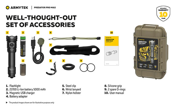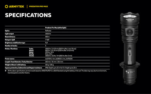 La lampe tactique Armytek Predator Pro Max est une lampe tactique haute performance offrant 3000 lumens et une portée de 590 mètres. Produit phare de la série Predator, elle intègre plus de 15 ans d'expérience et de développement pour créer le faisceau le plus impressionnant pour une lampe tactique, ce qui la rend idéale pour les opérations spéciales et la chasse.