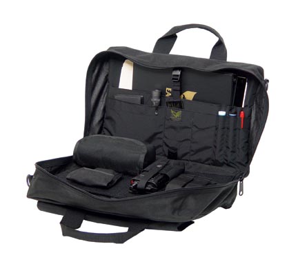 De Eagle's Attache Case (AC-1) heeft ongeëvenaarde mogelijkheden en is daardoor de ideale metgezel voor vrijwel elke situatie. Voor onopvallende persoonlijke bescherming is de verborgen "Fast Break"-tas voorzien van een ambidextreuze ballistische nylon pistoolholster met een elastische band van 3,8 cm voor een extra magazijn of opvouwbare wapenstok. Twee buitenvakken bieden u de mogelijkheid om documenten op te bergen en te openen zonder de inhoud van het hoofdcompartiment te onthullen. Het interieur bevat drie portemonneevakken over de volledige lengte, drie pennen- en potloodvakken, een vakje voor visitekaartjes, een rekenmachinevak en een vak voor diverse notitieblokken of soortgelijke items.