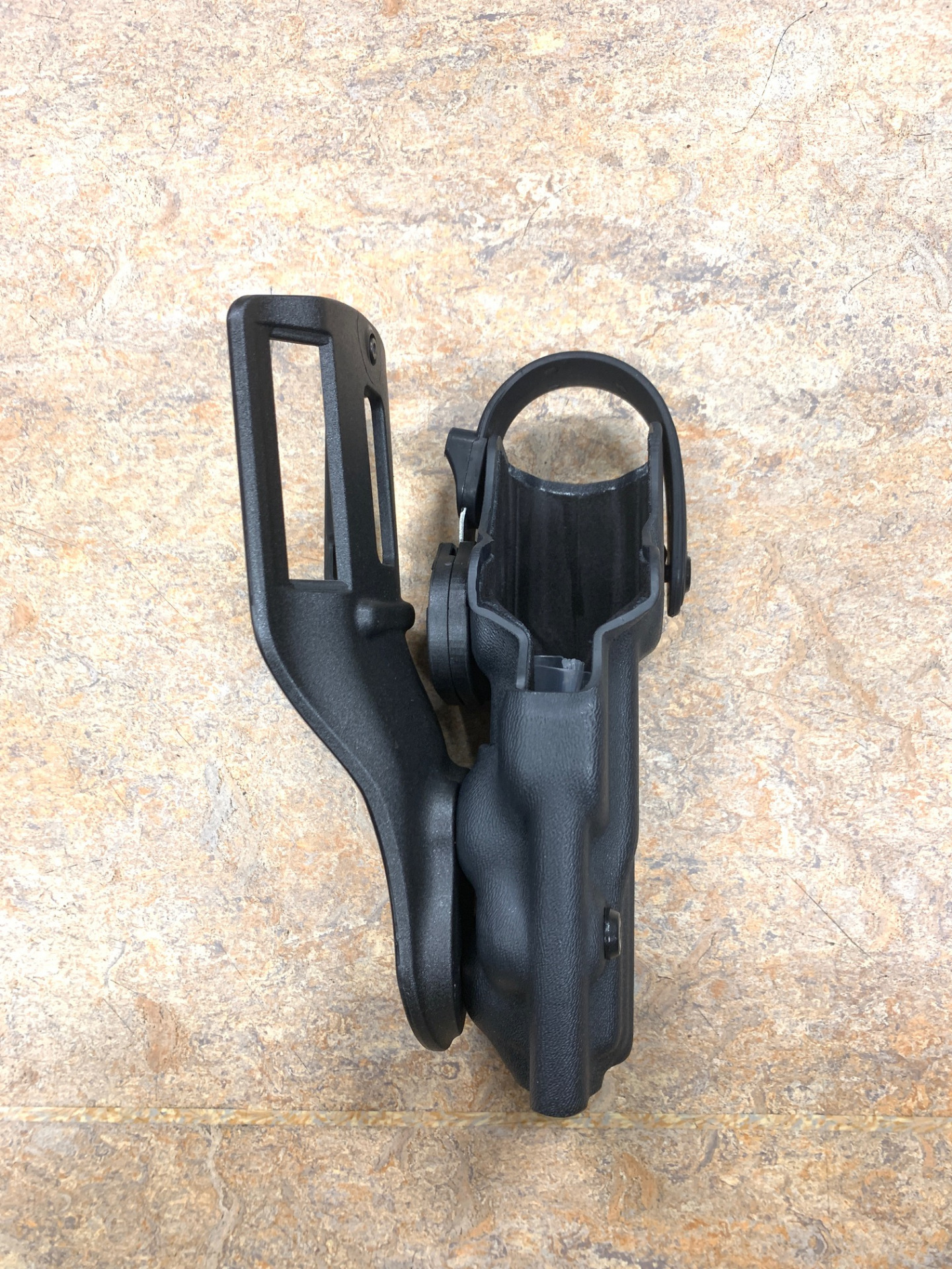 Le holster est équipé d'un système de rétention active au niveau du pontet, garantissant un maintien sécurisé de l'arme tout en permettant une sortie rapide et fluide. Le déverrouillage s'effectue naturellement lors du dégainé, favorisant une prise en main intuitive et efficace.